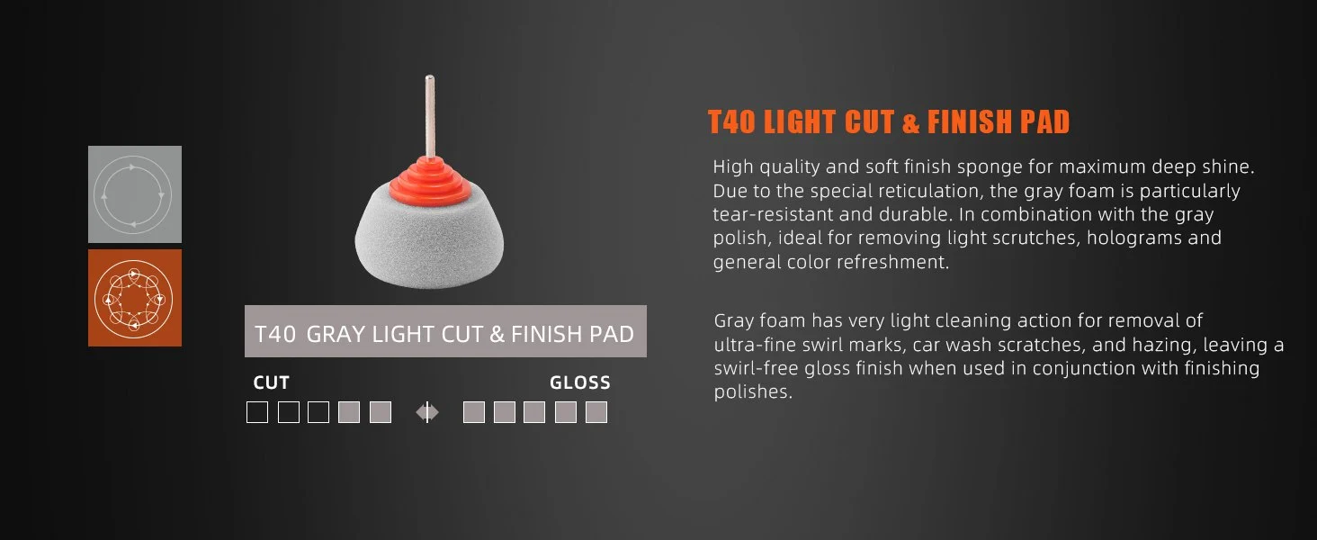T40 light cut & finish pad, high quality and soft finish sponge for maximum deep shine. Due to the special reticulation, the gray foam is particularity tear-resistant and durable